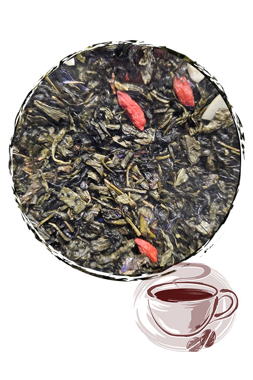 Зелений чай "Годжі - Мигдаль" - це чай китайський зелений, ягоди годжі, пластівці мигдалю, квіти мальви та волошка.