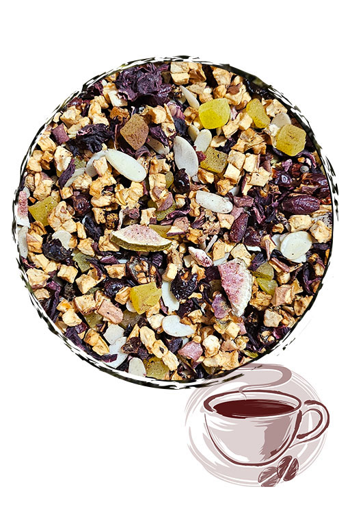 Фруктовий чай "Марципан" Склад: це суміш з  яблука, інжиру, ананасу, мигдалю, каркаде, скоринки шипшини.