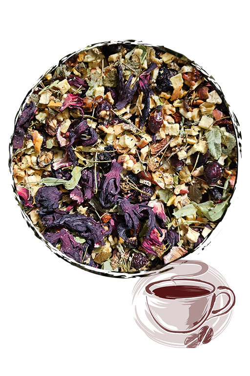 Фруктовий чай "Соковита Ожина" Склад: це суміш з яблука, ягід ожини, смородини, каркаде, скоринки шипшини, суцвіття липи, лист стевії та чорниці.